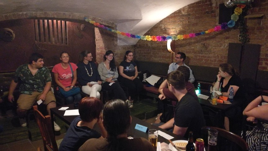 About a year ago we felt that our format needed a few adjustments to make newcomers or shier guests feel more comfortable. We extended our introductory section with ice-breaker bits that are always done in pairs, allowing everybody to take it slow instead of being thrown in at the deep end. We also spiced up the section in which we used to pick one random topic for the night. We now offer three alternatives, but the attendees have to vote on enigmatic, two-word titles, without knowing exactly what the topics are about. The organizers max out their cheekiness by altering the two-word titles now and then to make unpopular topics seem more appealing.
